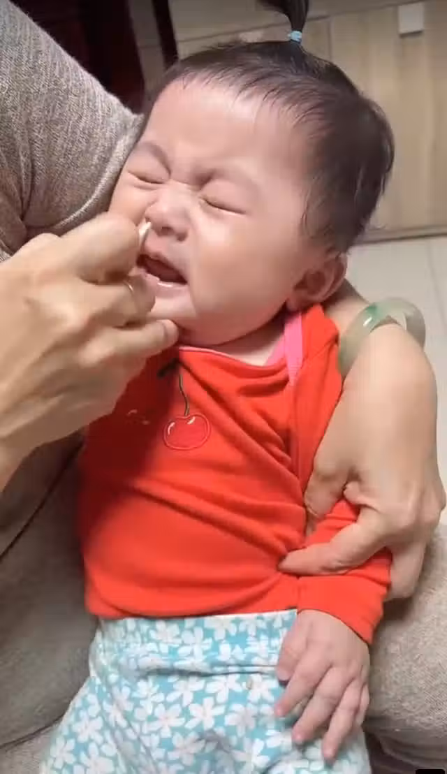 ▼寶寶鼻子通了,阿嬤協助將鼻涕擤出。(圖/網友Apo Chou授權提供)