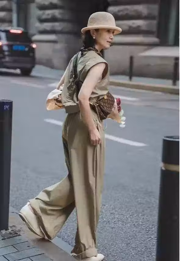 比起t恤,上了年紀的中年女人,在夏天裡更適合穿這種無袖上衣,很清涼舒適。簡約的款式,下身搭配的寬松長褲也是和上衣顏色一樣,上下同色系的組合,最容易打造出高級感,又時髦還不用擔心會出錯!