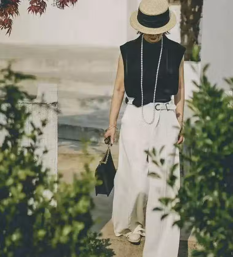 為了打破黑色無袖上衣帶來的沉悶氣息,三木媽媽下裝特意選擇了一條白色高腰闊腿褲,干凈純粹的白色,正好中和了有些壓抑的黑色。一整套顏色的搭配,很簡約又時髦,白色的闊腿褲長度是及地的,但因為高腰設計,再加上無袖襯衫也扎進褲子裡面,所以視覺上看起來才不會顯得拖沓!脖子上佩戴的白色珍珠鏈,增添了幾分雍容高貴的范~
