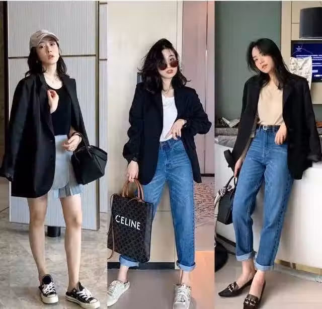 黑色西裝是職業感最強的單品,除了可以當作「工作服」,平時休閒逛街的時候穿也很OK。想把西裝穿得不再像工作裝,搭配牛仔褲時,建議把褲邊捲起來一些,露出點腳踝更顯休閒活潑。雖然搭配簡約,但時髦度可一點也不低。