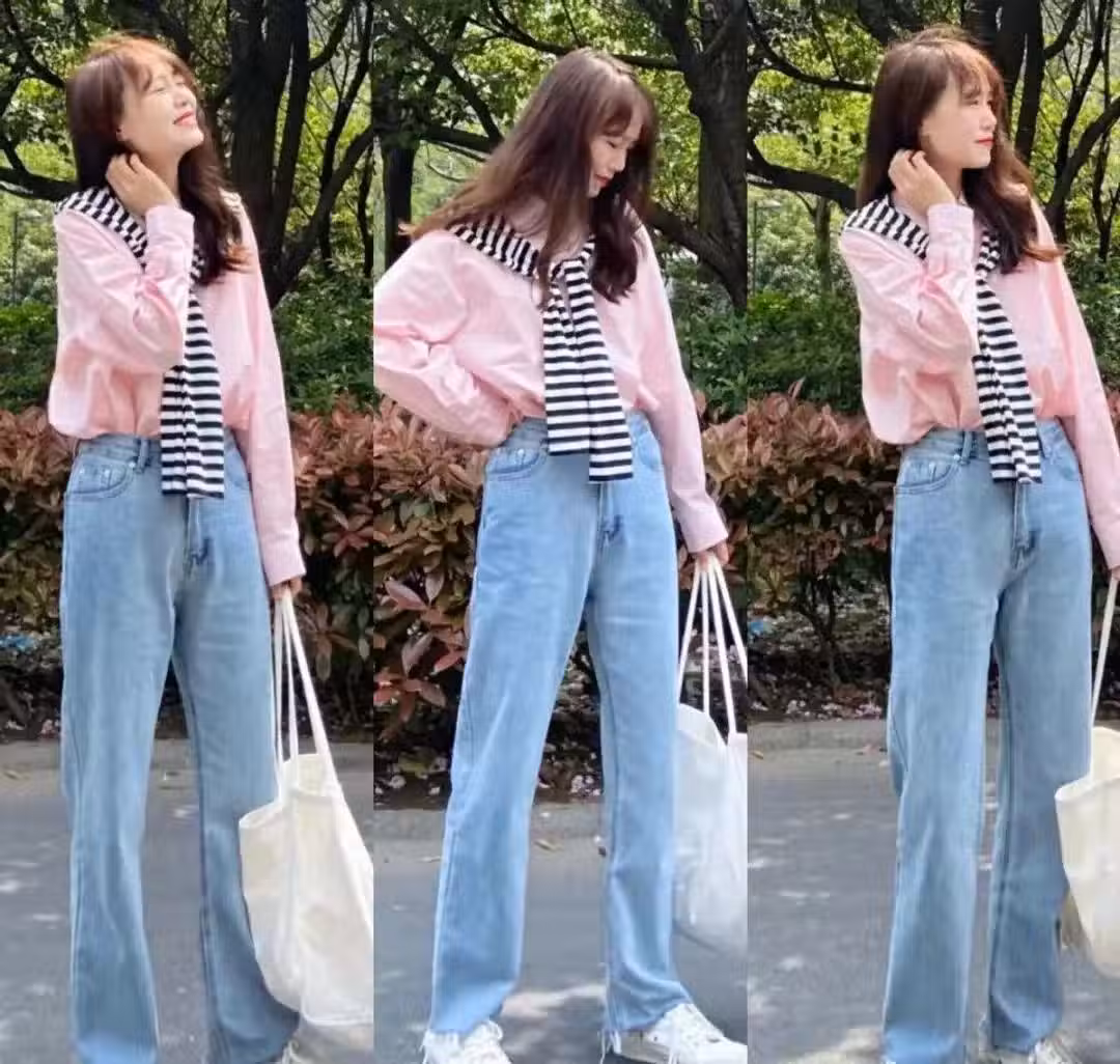 搭配一條淺色的直筒牛仔褲,直筒版型不貼身垂墜感強,很能修飾腿部線條,穿上身很顯腿直。一身穿搭配色清新舒適,元氣又有活力感,很是好看!