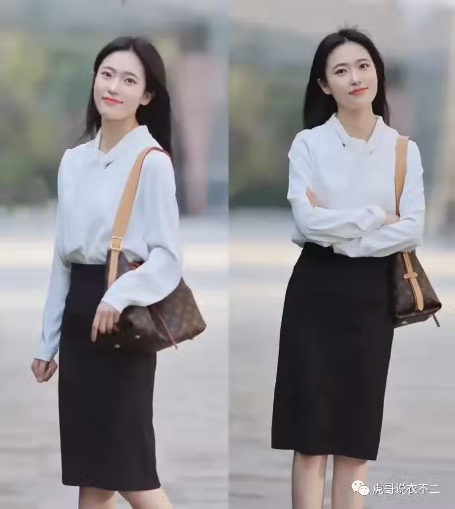 上圖這身白襯衫與黑色半身裙的搭配,運用撞色構造出了鮮明的層次感,正是因為色調的對比鮮明強烈,就可以將襯衫的衣角扎一下,上移腰線,從而穿出更優越的體型。