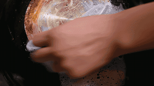 然後靜置3小時左右,用清水緩慢沖刷,就可以看到表面一層厚厚的油污漂浮在表面上,完全不需要使用蠻力。