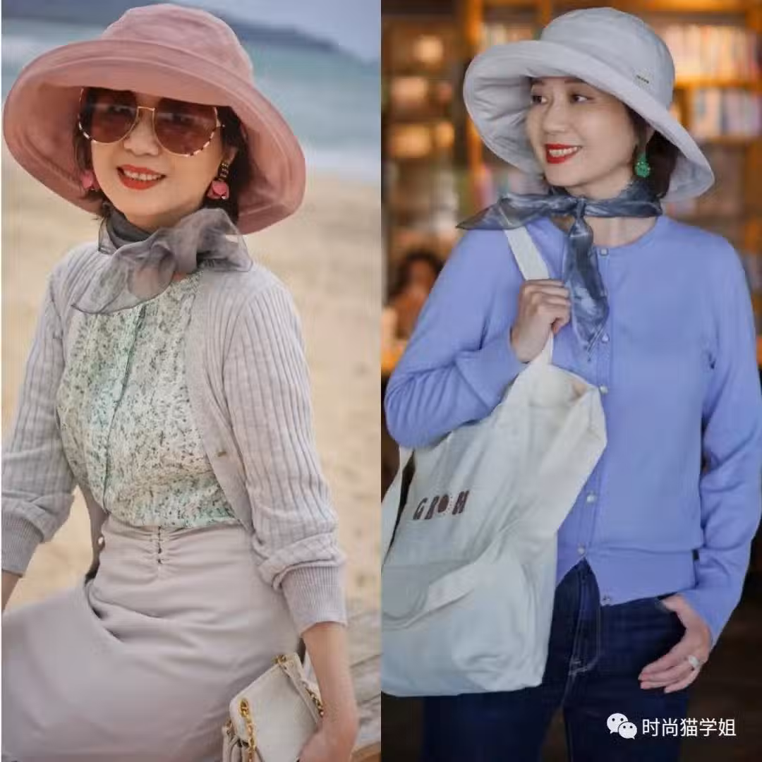 >>色彩選擇 最後,在選擇漁夫帽的顏色時,大家也可以根據自己的膚色進行選擇,與膚色適配的漁夫帽會讓整個人看上去更洋氣、更有氣色。例如白皮女性更適合亮色系漁夫帽,會顯得整個人明艷有氣質;黃黑皮女性則更適合簡單的基礎色,不易顯黑。 此外,在色彩的選擇上,大家也可根據服飾的色彩進行順色搭配,例如下圖的穿搭就利用上衣+帽子同色的組合方式,非常耐看。