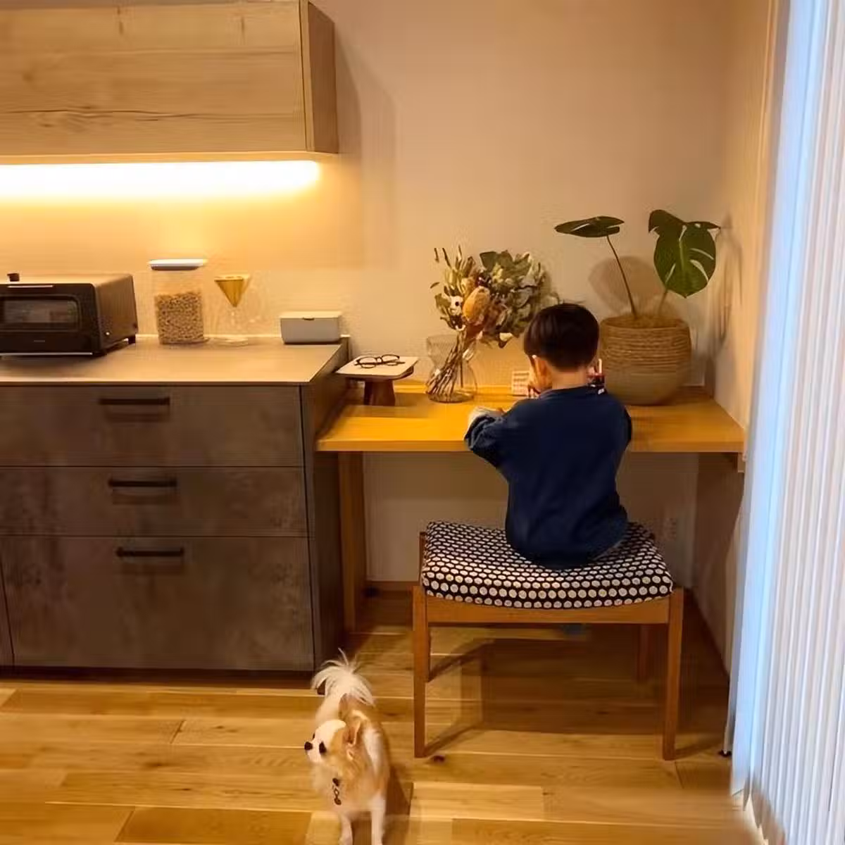 廚房的位置,特意為狗狗安置了一個小窩。沒有傢俱的阻礙,狗狗也能自由地穿梭,在家裡隨意撒歡。
