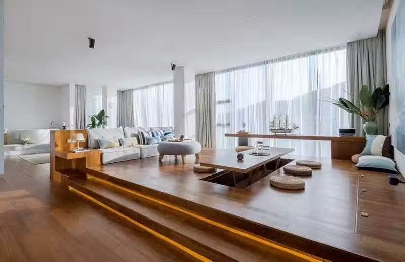 或者電視櫃連著餐邊櫃做整面的收納,局部抬升用地台做休閑,也不失為一個好的辦法。