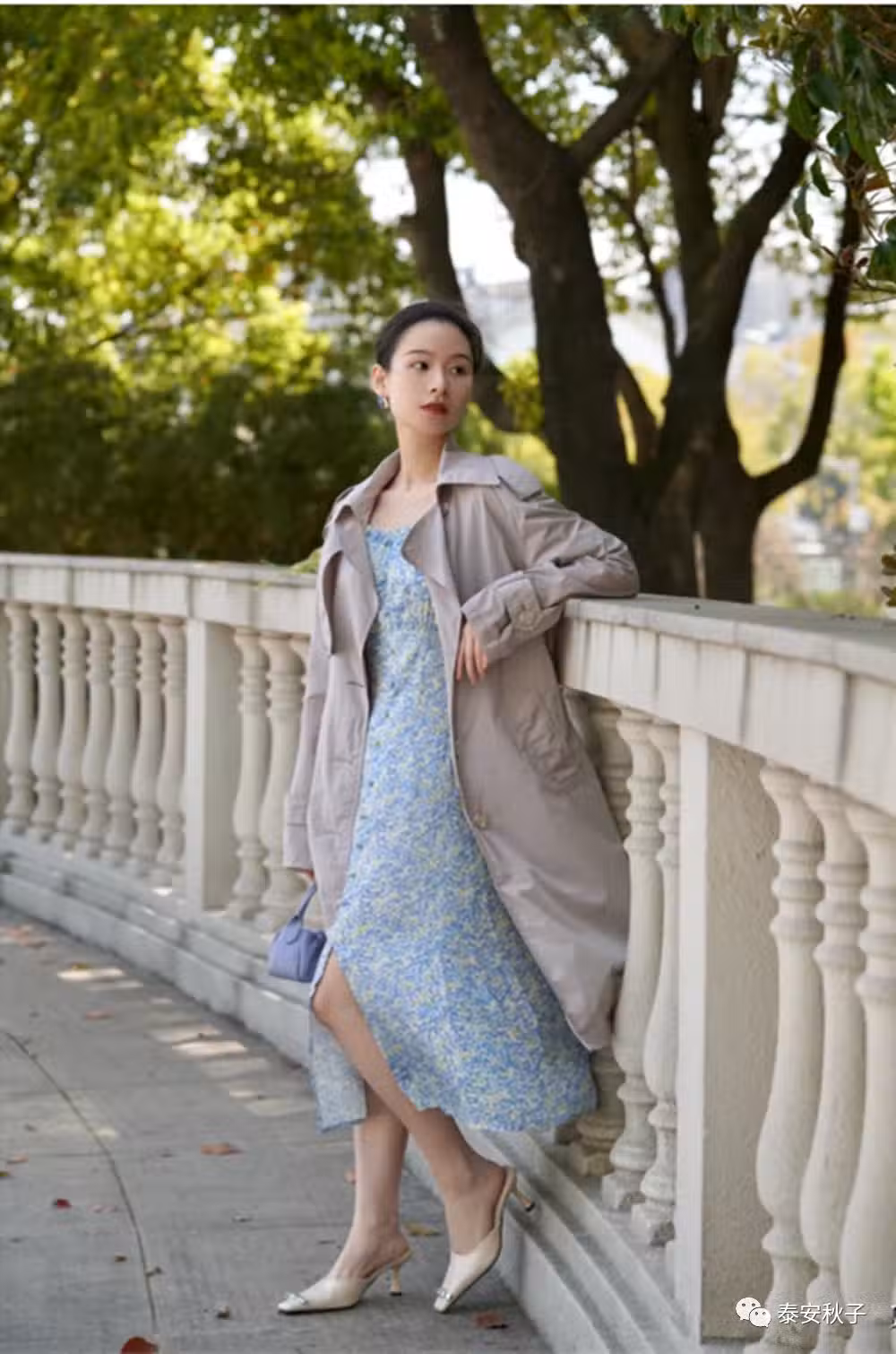 水藍色碎花連衣裙,搭配簡約、時尚的淺鼠灰色輕薄風衣,兩種流行的色調完美過渡,凸顯出文藝優雅的絕佳氣質。