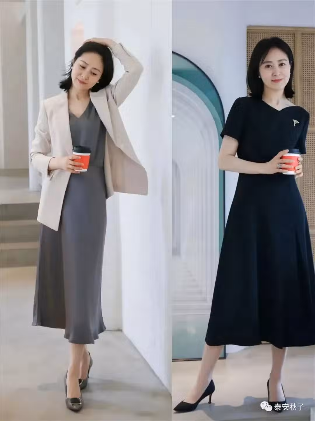 可以借鑑這位40歲媽媽的方法,穿條簡潔連衣裙,再配雙與裙身同色的鞋子,會讓整個造型凸顯出一種協調性。