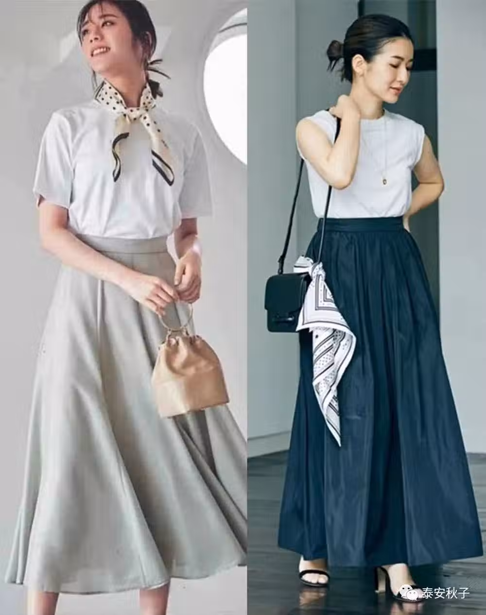 黑白相間的條紋絲巾,垂在黑色中長裙的旁邊,與白色的T恤衫相互映襯,簡約又有層次感,非常符合夏日時尚氛圍。