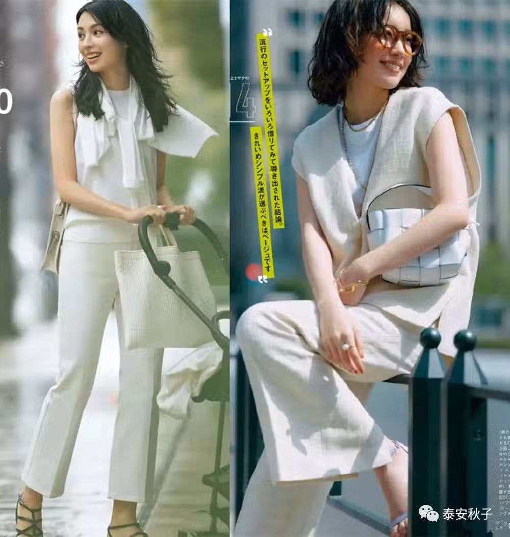 右圖中的美女,身穿的這條米色九分闊腿褲,簡約又很百搭。