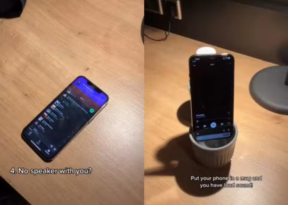 把手機立著放在馬克杯上可放大聲量,營造出音響的效果。