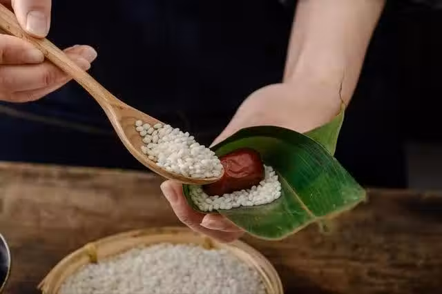 4、不過這個時候哈,還需要再往水中,多加1味料,它就是食用鹼。加上食用鹼煮出來的粽葉,延展性、柔韌性更好,並且還會激發出更濃郁的香味,再一個就是可以讓粽葉的顏色更漂亮、更翠綠,這是「第二個重要步驟」。
