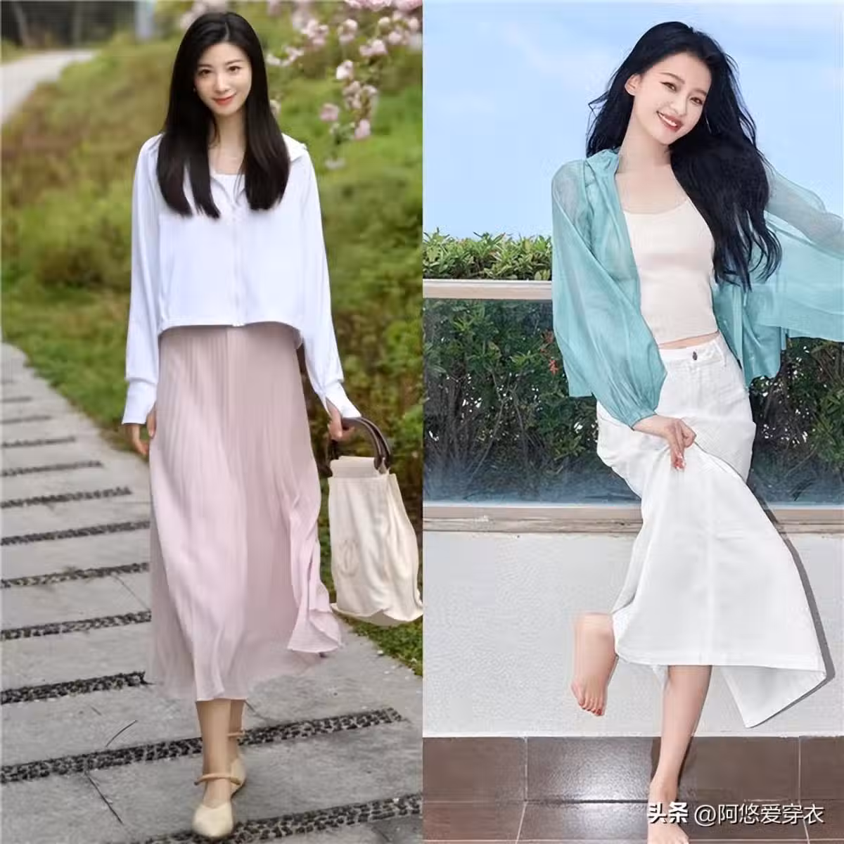 穿防曬衫搭配半身裙,基本上還是會讓我們的部分肌膚展現出來,比如說下半身瘦的女生可以穿短裙配短款的防曬衫,把你的大長腿給體現出來,腰細的姐妹也可以在穿防曬衫時配短內搭,露出腰身,降低沉悶感,增加露膚度。