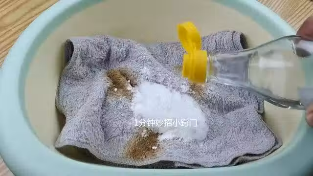 首先,我們將毛巾放在臉盆里,加入三勺白醋,白醋可以軟化毛巾上面的一些油漬,方便輕鬆被揉搓下來。然後放入一些小蘇打一起浸泡,小蘇打遇到白醋,會發生反應。接著,我們倒入適量的溫水,靜置三分鐘左右。在這個過程中,小蘇打會起到清潔和柔軟毛巾的作用。而白醋水,可以軟化毛巾上面的一些污漬,一會用手揉搓毛巾,就可以輕鬆去除上面的污漬了。