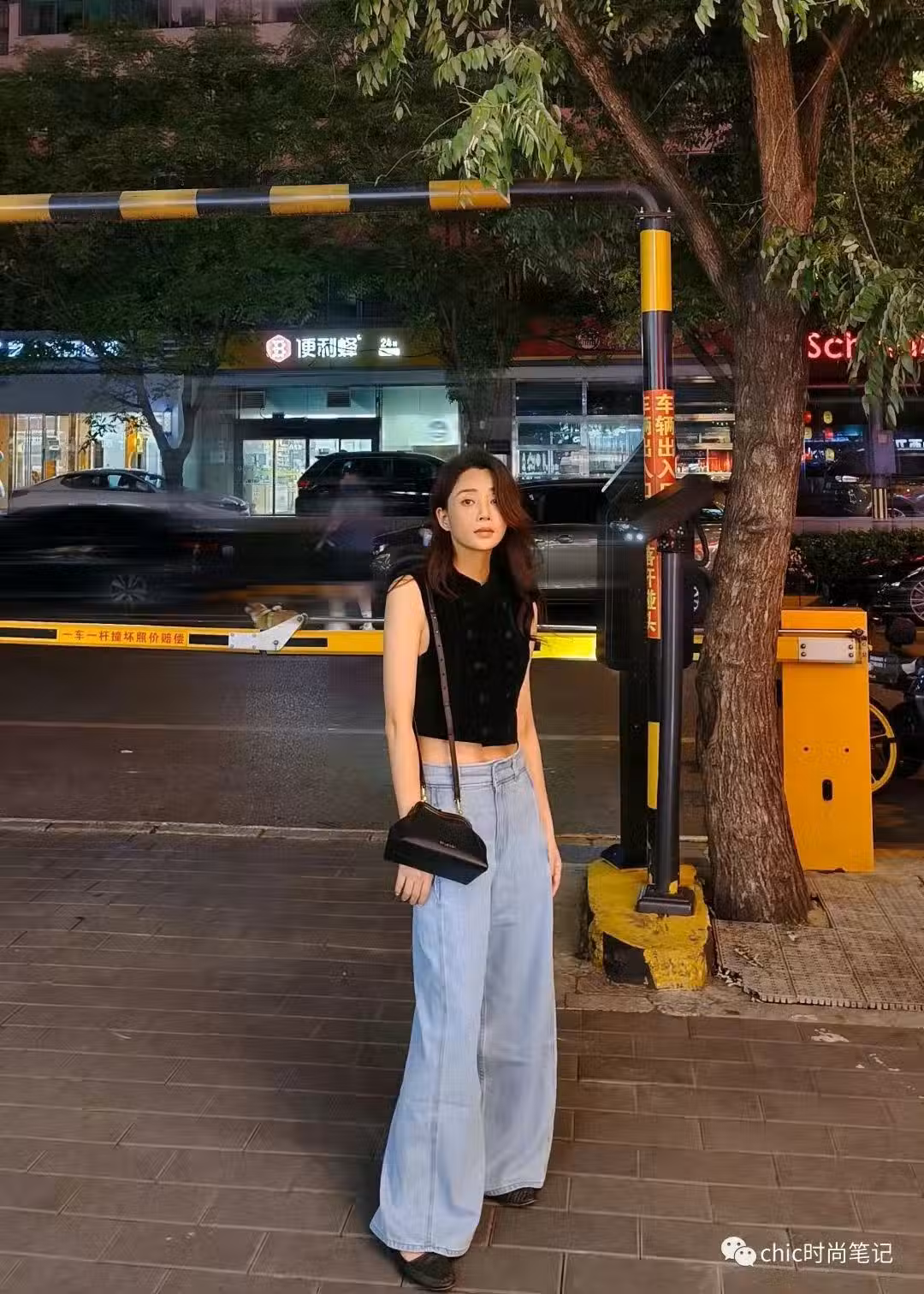 黑色露腰背心搭配水洗藍牛仔闊腿褲,上緊下松的穿搭完美的勾勒出殷桃纖細的腰線,一頭微卷長發的加持,讓整個造型更加精緻慵懶范。
