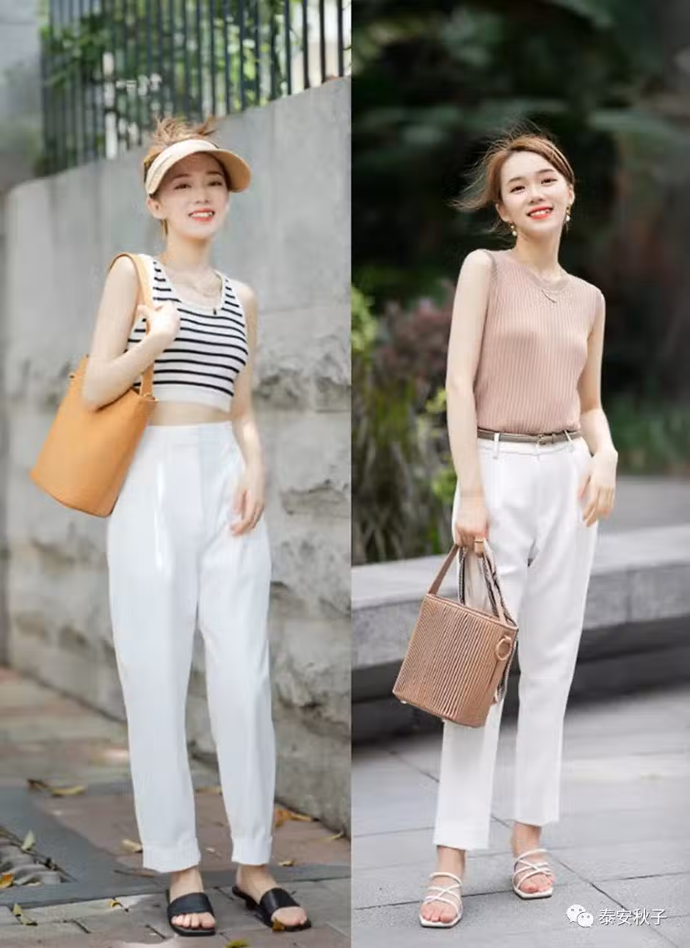 小個子女人在穿略略小白褲的時候,儘量了「短+高」的搭配技巧,來顯瘦又顯腿長的時尚效果。