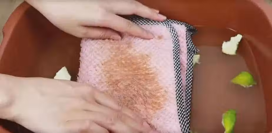 大家然後把發黃的毛巾裝進去泡浸,使它泡個10分鐘,到時間以後我們就可以拿手用勁揉搓這一毛巾,以前發黃變黑的毛巾在搓洗後也變得干凈整潔了,一點也看不出來發黃的模樣,所以這些污垢早已被泡出來。