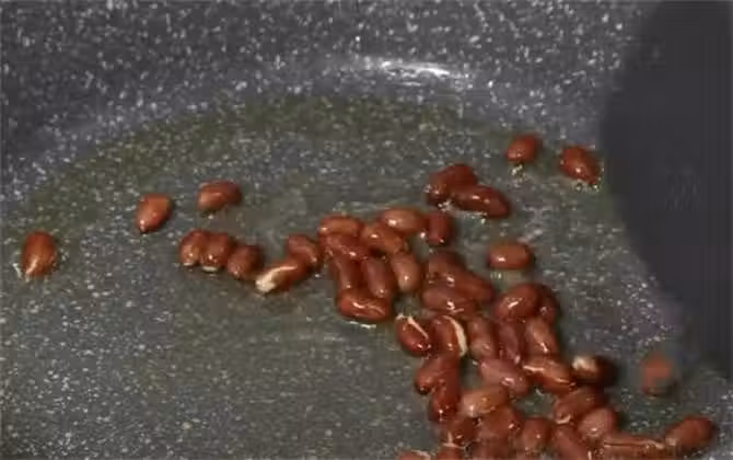 8.起鍋倒入少許食用油,然後倒入適量花生米,開小火慢慢翻炒,把花生米炒熟炒香,期間要不停的翻動,使其受熱均勻,避免花生米炒糊,把花生米炒熟炒至酥脆,像這個樣子就可以,控油盛出。
