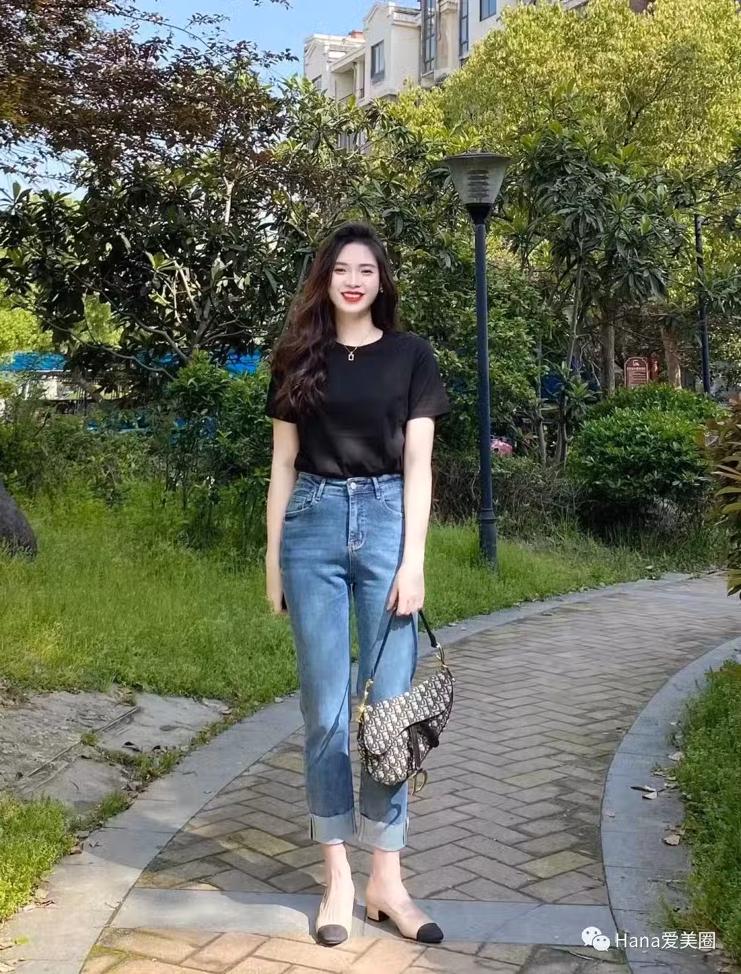 像這位模特就選擇了高腰的直筒牛仔褲,和其他的牛仔褲版型相比,直筒褲是最保險的一種版型,它不僅能夠修飾身材上的小瑕疵,同時還有助於拉高腰線,優化身材比例的作用。 像模特選擇的這條褲裝還做了卷邊的設計,這樣也增添了夏季穿搭的活潑俏皮之感,再搭配一雙淺口的高跟鞋,整套穿搭可以說是很有氣質了。