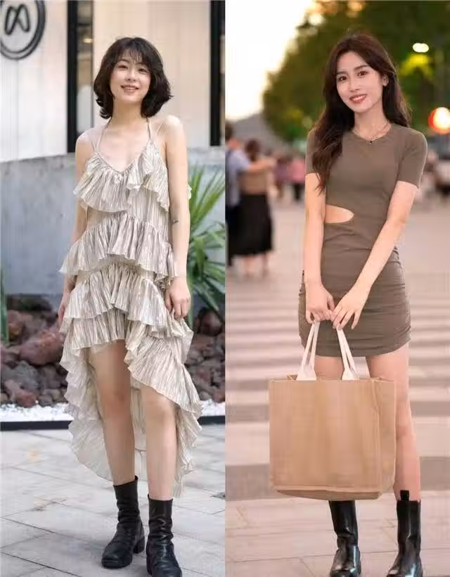 最近火了一種穿搭叫:連衣裙+裸靴,今年早秋這麼穿,洋氣又顯瘦