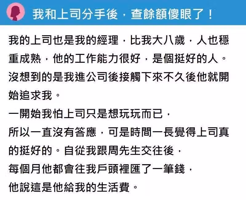 和大8歲上司交往,他每月給我生活費持續了1年多,直到分手後我一查餘額,當場傻眼了!