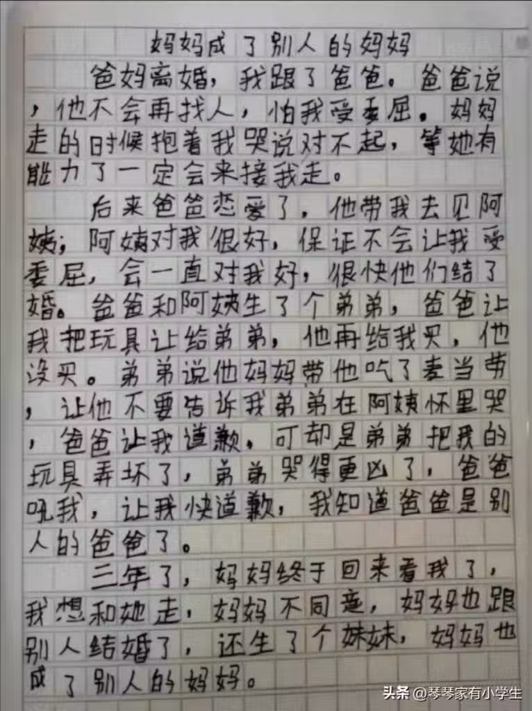 父母離異!孩子寫下「心碎作文」:媽媽成了別人的媽媽,3年後看透「承諾全跳票」句句戳心