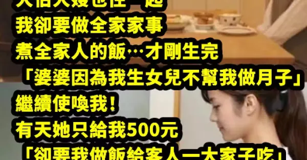 我是個孤兒,因為沒娘家一直被婆婆欺負!大伯大嫂也住一起我卻要煮全家人的飯菜、做全家家務事…才剛生完「婆婆因為我生女兒不幫我做月子」繼續使喚我! 有天她只給我500元「卻要我做飯給客人一大家子吃」,我收下後「淡定端出10幾道菜」讓婆婆當場嚇傻