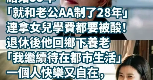 結婚33年「就和老公AA制了28年」連拿女兒學費都要被酸! 退休後他回鄉下養老,「我繼續待在都市生活」一個人快樂又自在,最近接到婆婆離世消息「老伴要求我也回他老家」我笑回4個字...