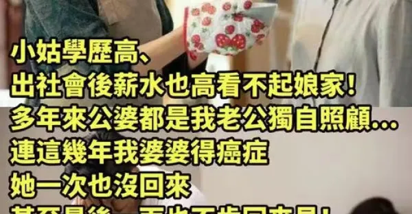 小姑學歷高、出社會後薪水也高看不起娘家! 多年來公婆都是我老公獨自照顧...連這幾年我婆婆得癌症,「她一次也沒回來」,甚至最後一面也不肯回來見!結果婆婆「喪禮一結束」她就出現問:媽的房子怎麼分? 我正要為老公說話「下秒老公開口了」