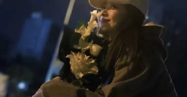 譚松韻拿花路邊玩自拍,開心奔跑笑容超甜