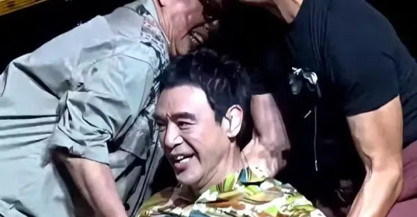 好險!71歲鍾鎮濤演出時意外摔傷,起身後又被絆倒,眾人摔成一片