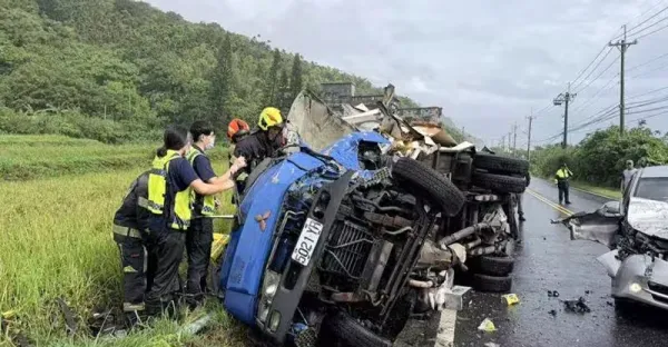 花蓮颱風天拖板吊車失控過彎 小貨車遭尾掃「翻車報廢」駕駛命危