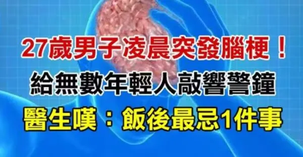 27歲男子凌晨突發腦梗!2小時後離世「給無數年輕人敲響警鐘」 醫生嘆息:飯後最忌1件事